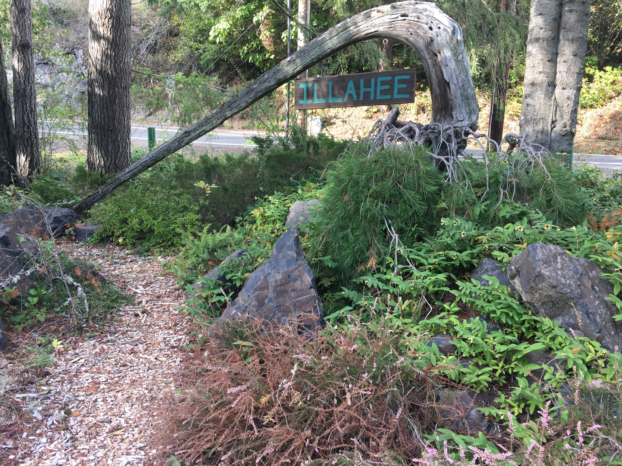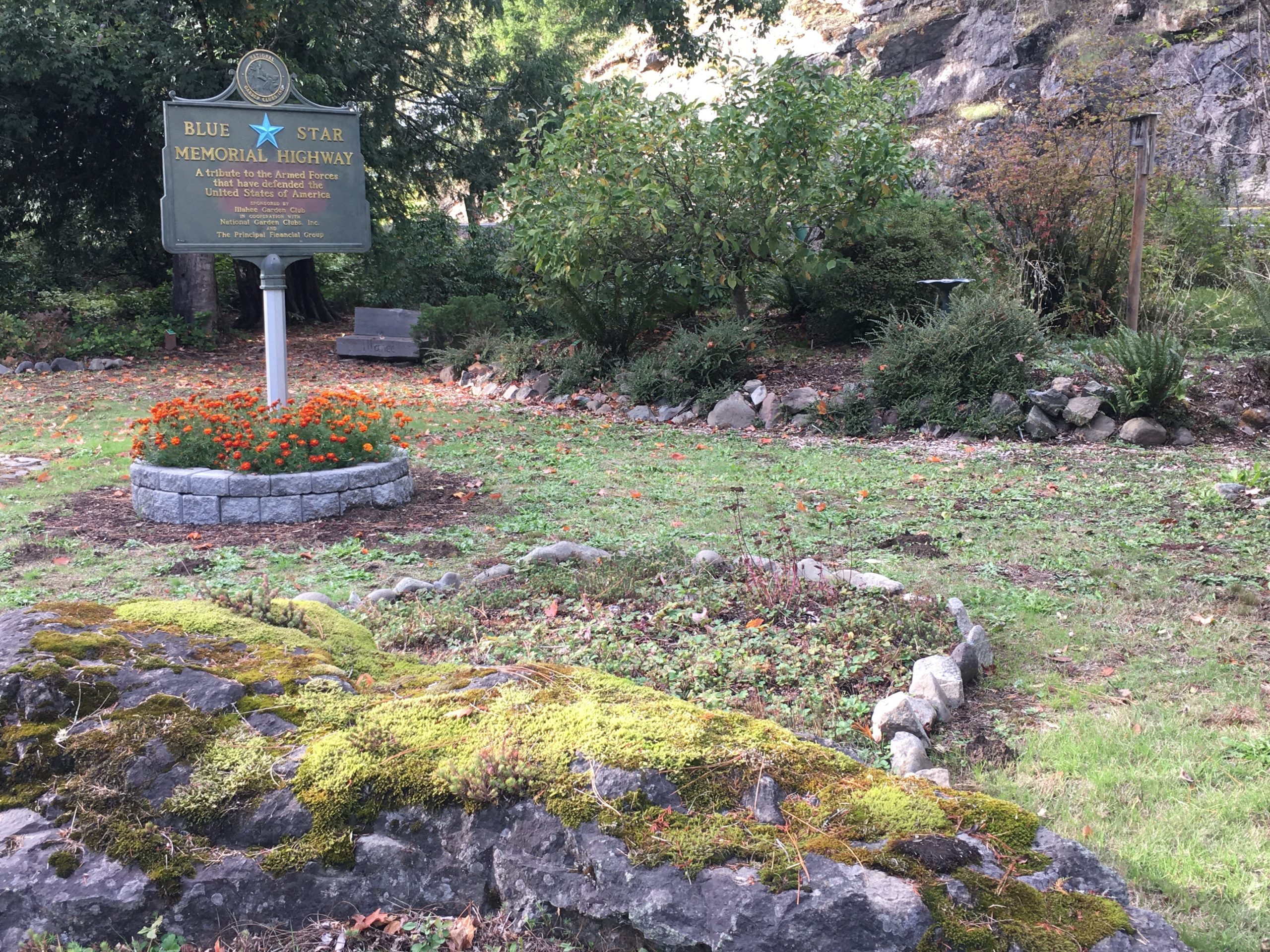 The distinction of the Blue Star Memorial Highway was bestowed on this Illahee Roadside Park in 2007. The National program sets tribute to all men and women who serve in the US Armed Services and was started by the National Garden Clubs, Inc. in 1945 during World War II. A flagpole was added to the park at that time. Illahee, meaning the Universe, the sun, moon, stars, the earth, and every growing thing, aptly applies to this group dedicated to preserving our native gardens.