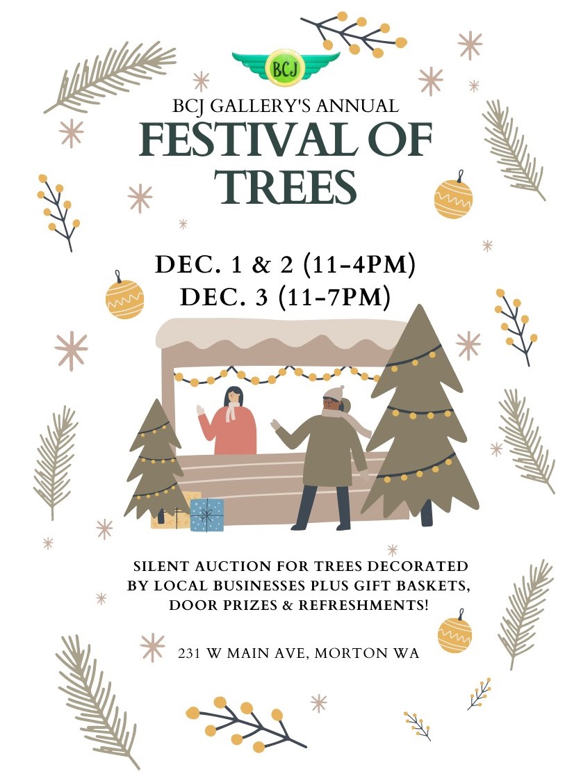 BCJ Gallery‘s annual FESTIVAL OF TREES silent auction runs Dec 1 – 3! Come by the gallery to bid on your favorite tree or gift basket while you enjoy refreshments and holiday shopping!